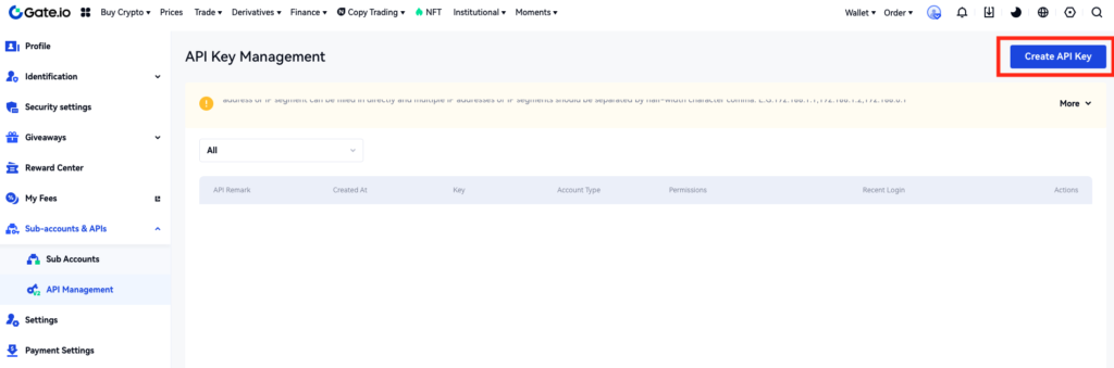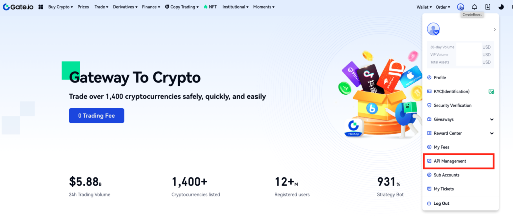 Step 1: Login your Gate.io account on desktop (not mobile). Place your cursor on top of the profile icon to unfold the menu and click on “API Management”.